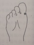 足の親指の付け根から少し足裏に入ったところ。咽頭痛があるときは押すと痛みがあります。